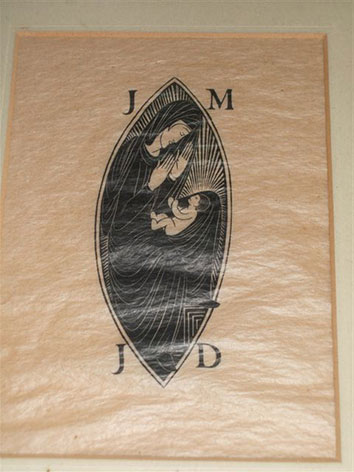 Woodcut. A design for a bookplate perhaps. 14cms by 10cms. On fine tissue paper, somwhat creased. In 1950s frame.